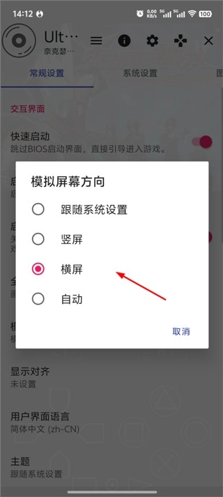 然后找到屏幕方向,选择模拟屏幕方向为横屏;