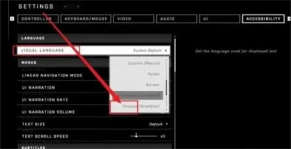 接下来点击VISUAL LANGUAGE(即语言功能选项),在里面找到CHINESE(也就是中文选项),点击它就能完成切换了。