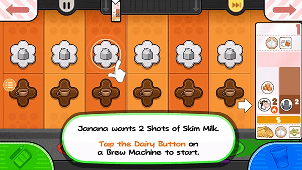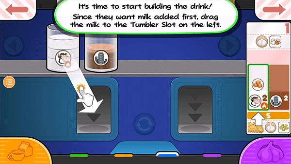是时候开始制作饮品啦!由于他们打算先加入牛奶,所以把牛奶拖到左边的不倒翁槽里。