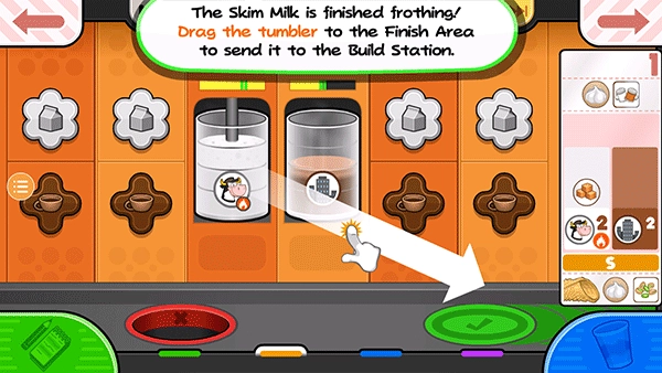 脱脂奶泡好了!拖动不倒翁完成区发送到建设站。