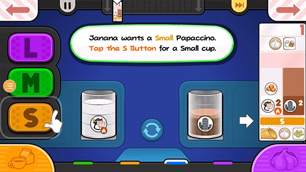 贾纳纳想点一杯小份的Papaccino,需要点击小杯子对应的S按钮。