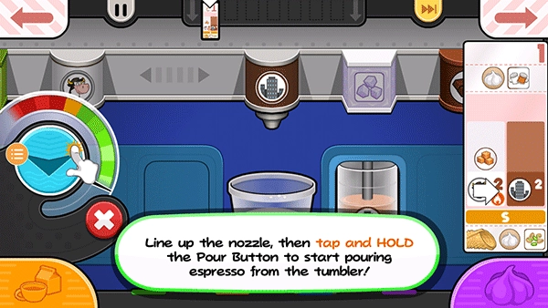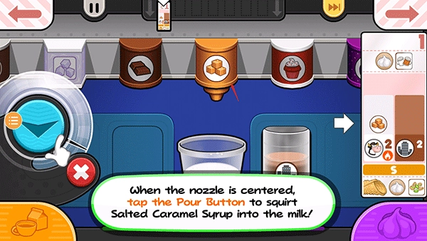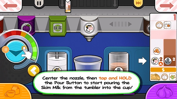 从票据左侧的项目处开始拖动容器,让左边的脱脂牛奶杯喷嘴对准杯子上方的中心位置。按住倒奶按钮持续添加脱脂牛奶!要是仪表快要接近红色区域,就松开倒奶按钮,等指针降下来后再继续倒!