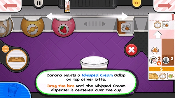 Janana希望在她的拿铁里添加一个鲜奶油球。拖动容器,直至奶油分配器处于杯子的正中央。
