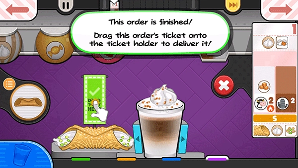 您已经把票左边的内容都添加好了,现在该添加右边的项目啦!拖动箱子,直到城市烘焙咖啡杯的喷嘴位于正中间。