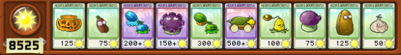 (这里以经典八炮为例)首先是选卡环节:大蒜(必须选)、冰瓜、西瓜投手、高建国、玉米投手、玉米加农炮、忧郁蘑菇、大喷菇、咖啡豆(这7张卡是用来搭梯结束后修补阵型的)、南瓜头(必须选)。