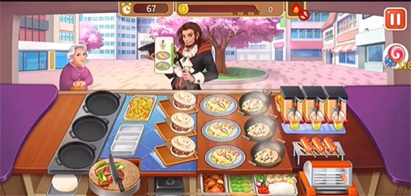 这款游戏的核心玩法是制作食物,玩家需要仔细观察客人的需求,在他们的满意度归零前完成食物制作并交付。游戏采用闯关模式,包含16个以上不同的店铺(即章节)。整体玩起来比较简单,但后期难度依然不低。