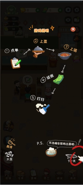 对了,再补充说明一下:在大堂里,点击大门或者向下滑动屏幕,就能切换到店铺外部场景;要是在大堂向右滑动,就会进入厨房区域;向左滑动的话,则会转到包间;而向上滑动屏幕,就能到达二楼。