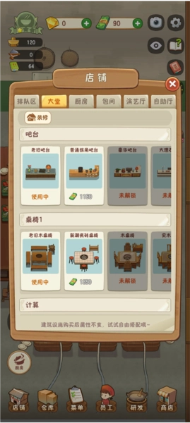 左上角能查看店铺等级及所需评分。设施评分只需购买物品即可提升,物品选择可根据个人情况决定。要是你习惯挂机,建议优先选择带有来客速度加成、顾客等待时间加成、顾客用餐速度加成和做菜速度加成的物品;如果你是佛系玩家,每天仅登录领取离线收益,那就优先购买有离线收益加成的物品就可以了。
