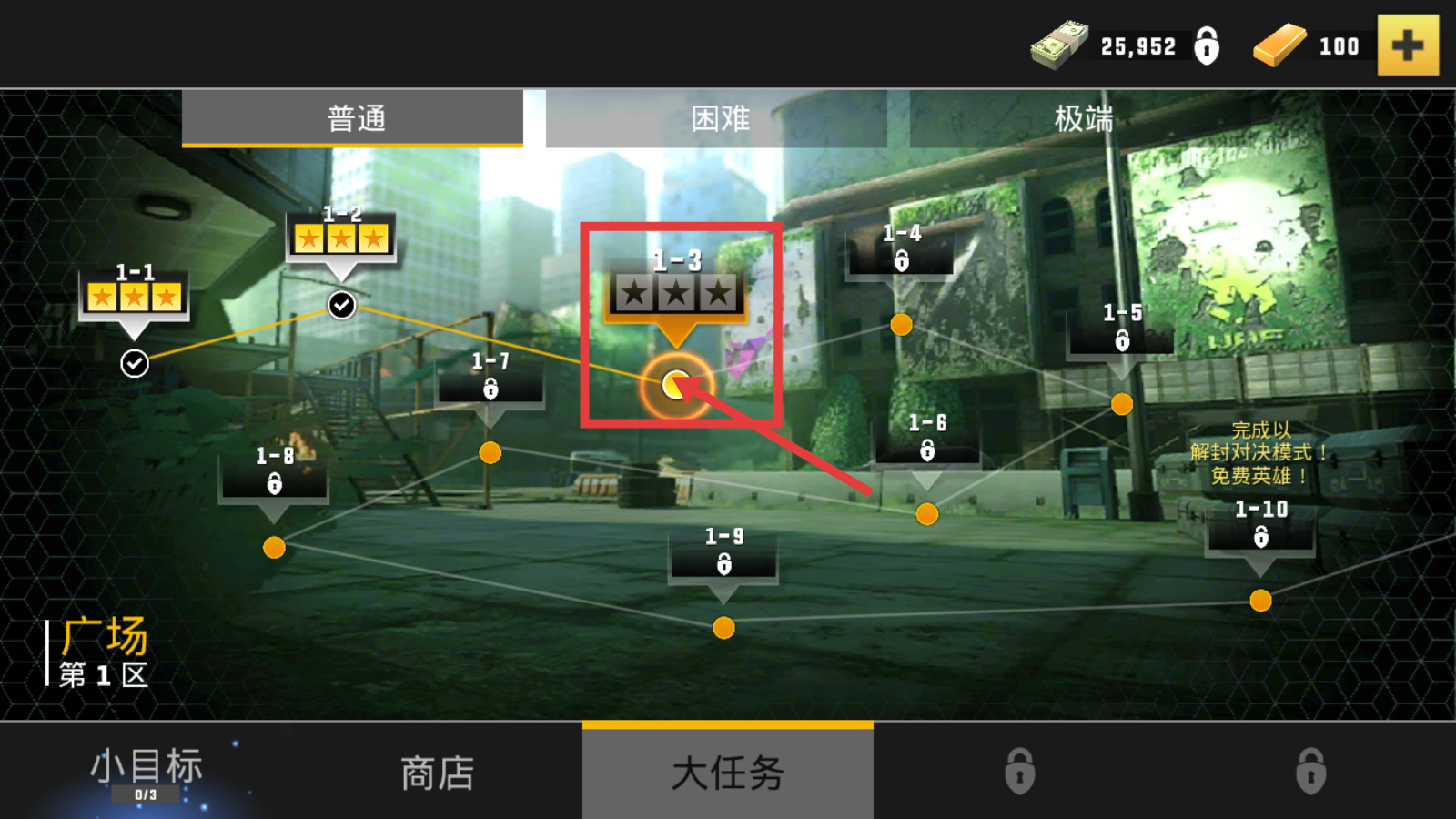进入【广场-第1区】后,建议优先挑战【1-3】关卡,以普通难度逐步推进,完成该关卡后将解锁后续关卡及相关资源。