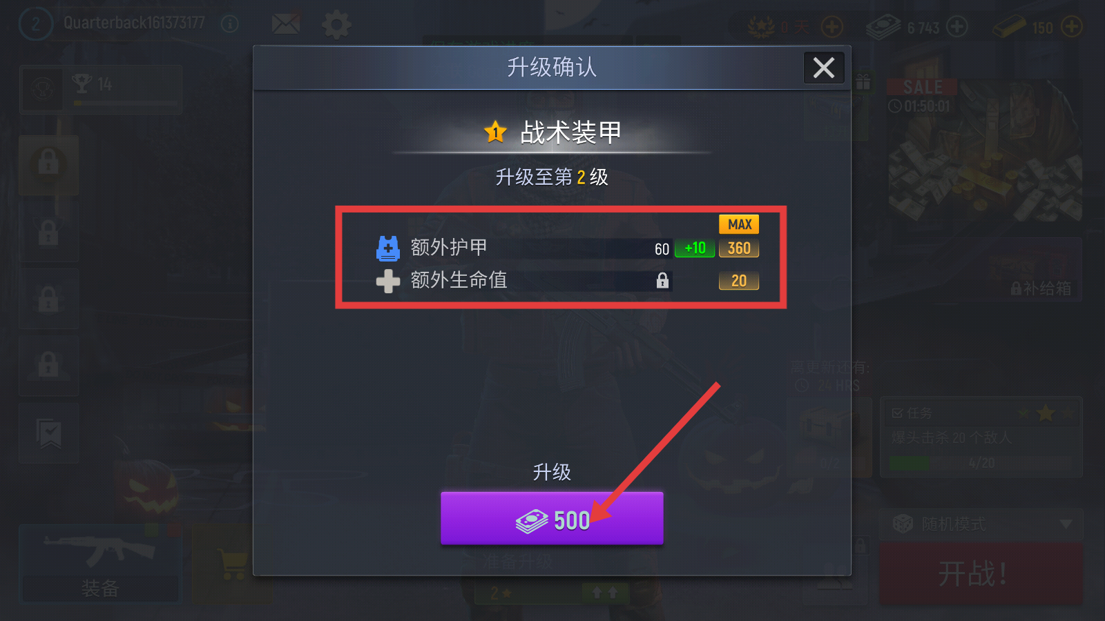 将【战术装甲】升级到第2级,需消耗【500】金币,可提升【额外护甲-60+10-360】,从而增强战斗中的生存能力。