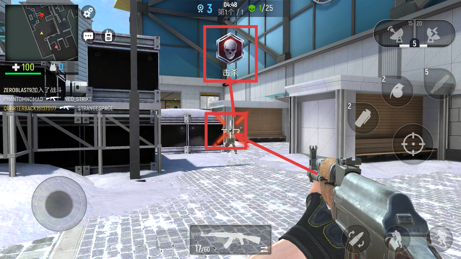 战斗时锁定敌人,用【AK-47-17/60】进行射击,顺利消灭敌人,积累战绩。