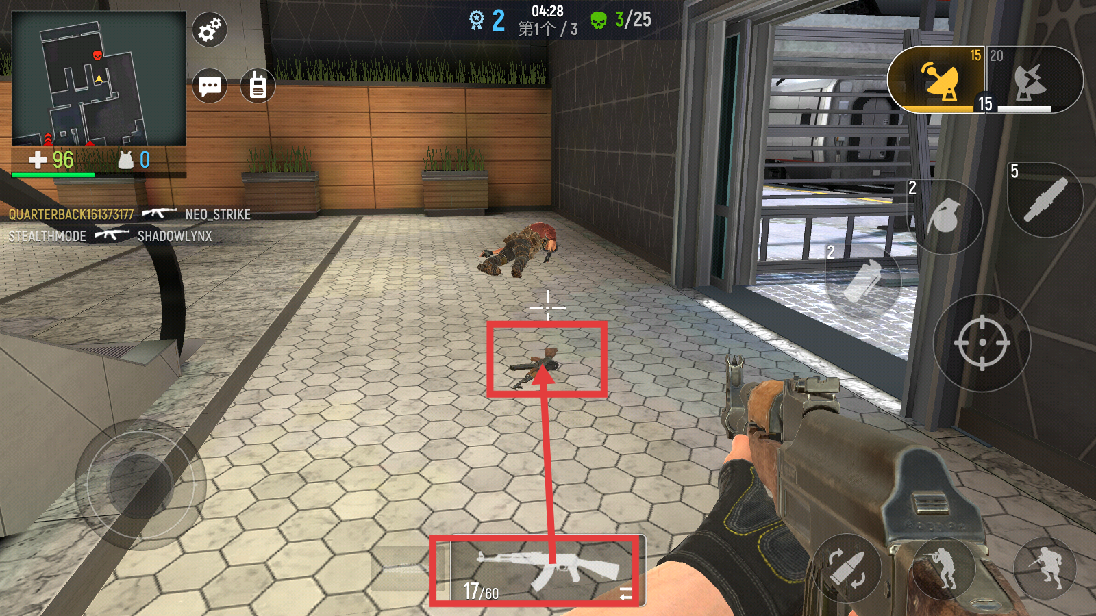 击倒敌人后,捡起掉落的武器,留意【AK-47-17/60】的弹药余量与自身血量,通过持续作战来提高战绩。
