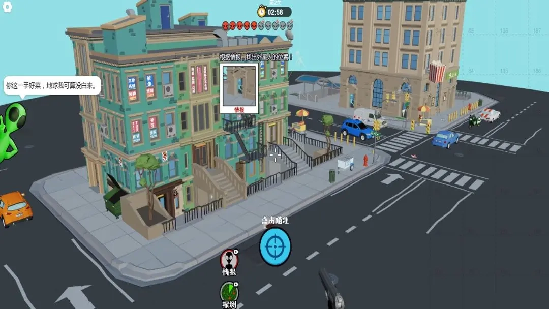 狙击外星人联机版的玩法颇具趣味,玩家可以在开阔的城市中自由探索,而形形色色的怪异外星人就潜藏在各个角落,需要玩家将它们一一搜寻并射杀。游戏过程中会触发诸多随机事件,大大提升了挑战难度;完成的任务越多,所能获取的奖励也会愈发丰厚。总体而言,这款游戏十分值得一试。