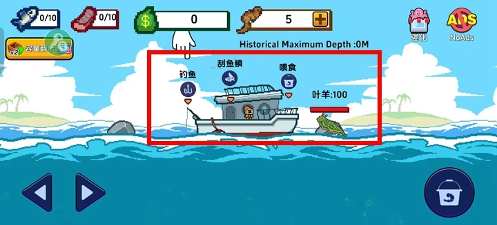 1、海上餐厅Scale the Depths游戏主要玩法流程:钓鱼、刮鱼鳞、喂食升级餐厅经营规模。
