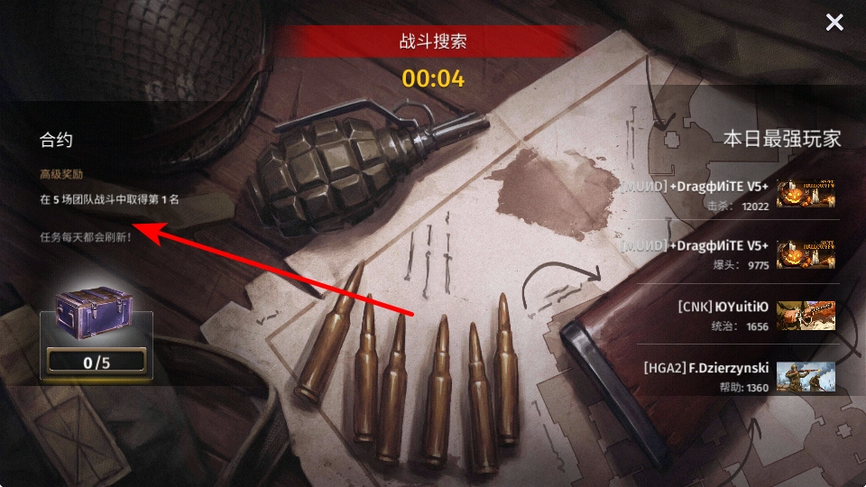先了解清楚合约任务的具体内容,接着进入战斗搜索界面,查看像“在5场团队战斗中拿下第1名”这类合约任务,从而把游戏目标弄明白。