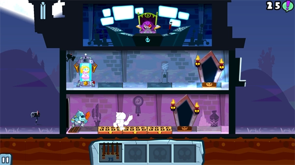 美术风格上,选用了色彩浓郁的粗线条美式卡通风格,画面呈现为横版2D形式,通过横切面的独特视角将古堡内部结构完整展现出来。背景营造出昏暗朦胧的氛围,仅古堡内部零星分布着微弱的灯光。角色刻画采用卡通抽象的手法,虽缺乏真实感,却着重凸显了其趣味性的一面。