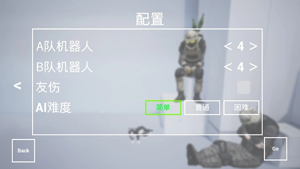 完成上述操作后,接着对游戏进行配置,你可以设定机器人队友与敌人的数量,还能调整友军阵亡规则和游戏难度,全部设置好后,点击右下角的“go”按钮就能进入游戏了。