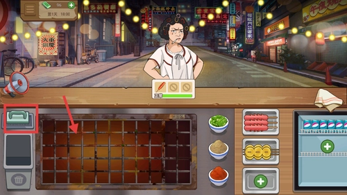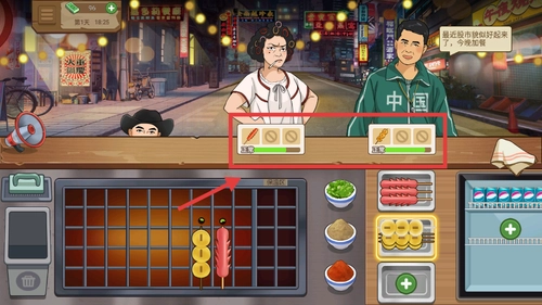 留意顾客头顶显示的订单信息,像烤肠、鱼丸、鸡翅这类餐品,需从食材区选取相应的原料,再把它们放到烤架上启动制作流程。