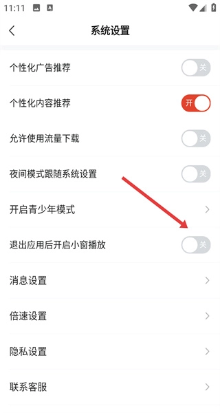 在系统设置页面,找到退出应用后开启小窗播放的选项,准备开展相关操作。