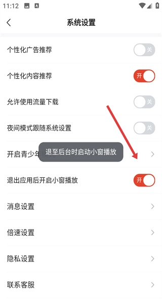 打开“退出应用后开启小窗播放”的开关,完成设置后,退出应用就能使用小窗播放功能了。