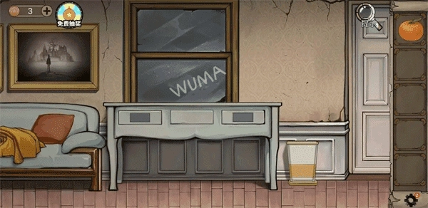 然后点击桌面上的食物。在窗户玻璃上看到字母。用字母打开左右边抽屉,左边抽屉用正常的WUMA打开拿到钥匙,右边抽屉用倒着AMUW打开拿到材料。用钥匙打开房门出去。