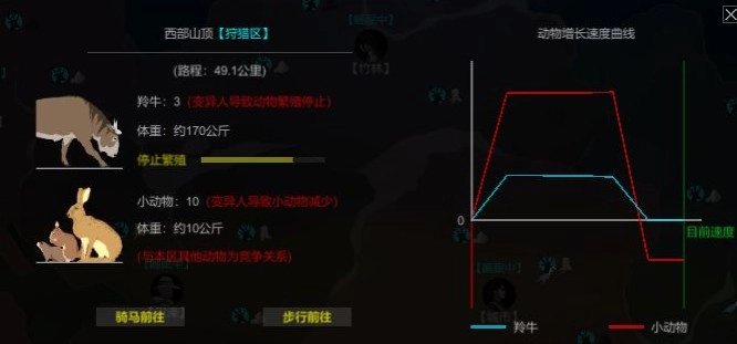 荒野生存允许狩猎,但这绝不代表你能毫无顾忌地滥杀动物!只有维持各区域动物数量的合理比例,才能让它们以最快速度繁衍,从而为我们提供更充足的生存资源。此外,若某片区域出现变异人或病毒横行的情况,同样会对动物的繁殖造成不良影响。