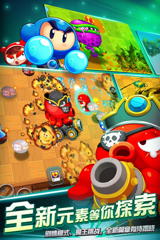 经典的泡泡堂元素,分分钟给你熟悉感受,完美的卡通界面,让你轻松的进入各个闯关任务中,用你的方式在这里闯荡吧,体味经典元素的闯关乐趣,
