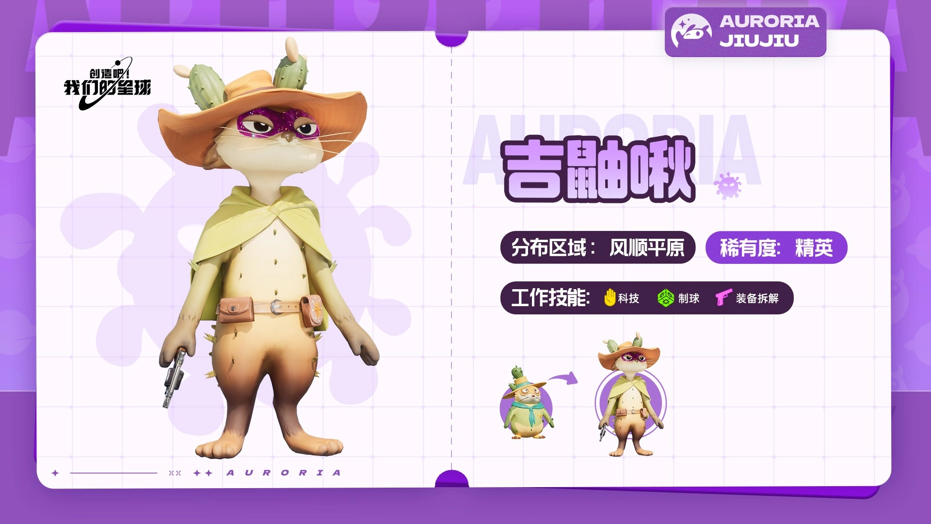 这是一种身形直立、形似鼬类的生物,头顶上生长着一些仙人掌,这些仙人掌或许能成为它们防身的武器。