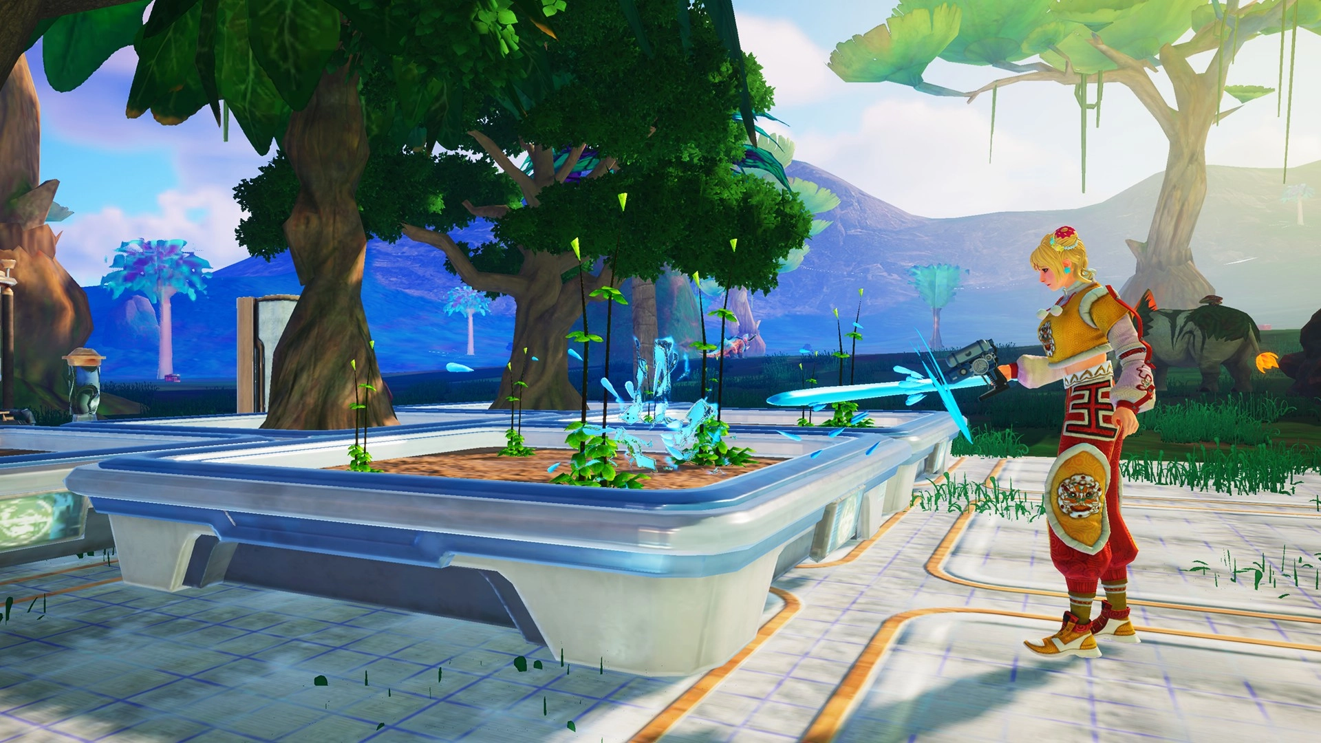 获得植物种子后,就能把它栽种到各种「种植盆」里。刚种下的植物还处于幼苗阶段,得用心照料才能茁壮成长,这时候用「水枪」给它浇水,就能促使植物启动生长进程啦。