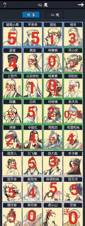 优先级参考图示,0级侠客是开局阶段几乎必须获取的核心;1级对应前期适配,2级适合中期发力,3级偏向后期补强,4级需到大后期才显价值,5级则属于可有可无或仅特定关卡适用的类型。前期若能抽出0级侠客,即可视为完美开局,其余侠客的优先级越靠前(越接近0级),对前期发展的助力越大。亲密伙伴资源务必留存,哪怕暂时卡关也不要轻易消耗!!