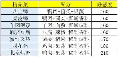 当然,凡事总有例外。第一个例外是蜜汁叉烧,它能增加170点好感度,却要消耗90元宝——和同样消耗90元宝的叫花鸡相比,好感度少了10点。第二个例外是北京烤鸭,消耗110元宝可增加210点好感度,而按照正常算法,它本应能增加220点好感度。