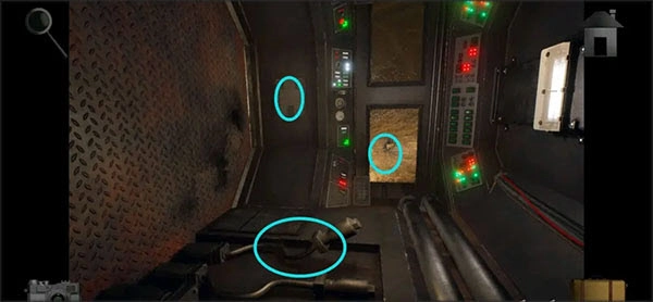 把油泼到集装箱的门上,进入房间后,先把桌子上的「磁铁」拿起来,接着依据车牌号的提示打开右侧的柜子,取出里面的「齿轮」和「紫外线灯泡」。之后把桌子上的灯泡更换掉,再留意查看出现的提示内容。