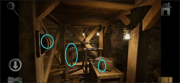 回到储藏室,用铁链把钩子和地下室的门把手连接起来,接着用锁将铁链固定好,再转动轮盘把地下室的门升起来。之后进入地下室,取下箱子上的「摇杆」,同时记住钟表显示的时间提示。