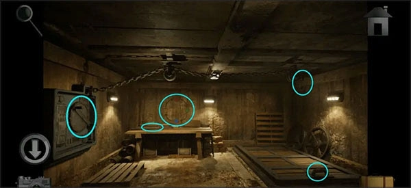 用钥匙打开区域左侧的储藏室,进入后留意墙上的提示,同时取走桌上的「断线钳」。之后点击左边的机关,转动轮盘让锁链降下。