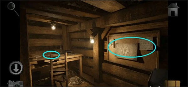 往里走进入办公室,观察桌上的蓝图,再依据蓝图上的提示打开木屋下方上了锁的盒子,完成这一步后,取走盒子里的「钥匙」和「挂锁」。