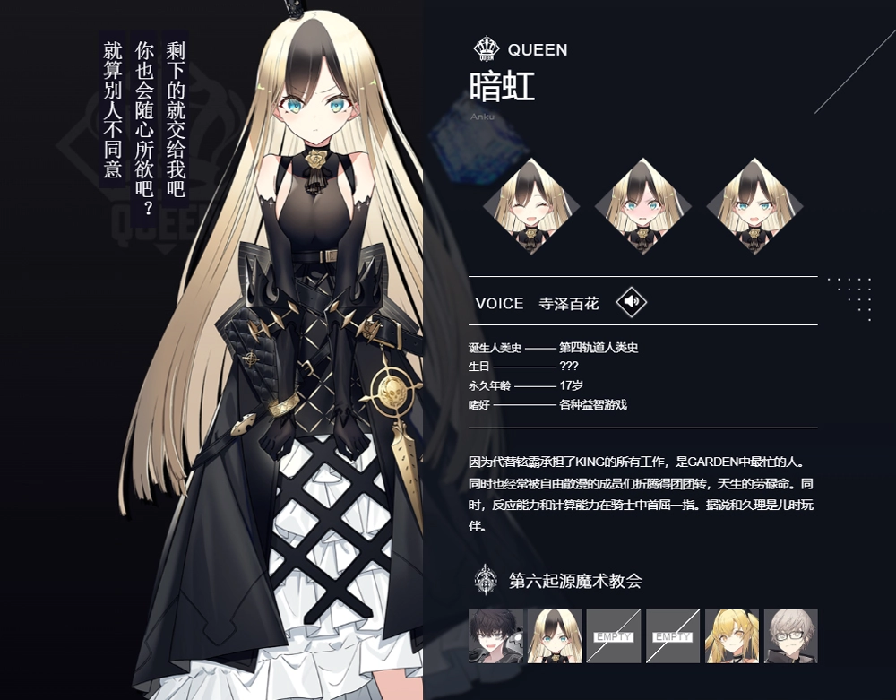 从诞生于第一轨道「剑锋凛光」的荣耀战士,到第二轨道「千紫」的神秘巫女,再到第八轨道「零射橙」的元气少年,在这里你将邂逅形形色色的「骑士」,一同编织专属于你们的羁绊吧!