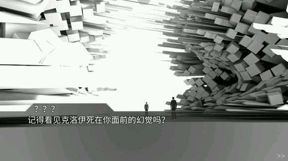 补充说明一下,第一回声里的克洛伊其实是怀有身孕的,这一点在梦境场景中有直接的呈现,到了最后也被明确点了出来。游戏进展到这里,终于显露出了冰山一角——我们不仅知晓了男主拯救女主这一使命背后的缘由,也对回声装置有了初步的认识。不过就像第一张图片里的对话所揭示的那样,第二回声中男主看到克洛伊被杀害的画面其实是幻觉,可紧接着,诡异的事情就发生了。