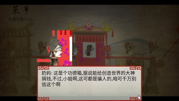 这一幕不存在隐藏线索,不过点击功德箱会自动跳转到网页;点击最后一行文字,就能获取进入异世界的密语:[1→2→3→4→4],它代表游戏的游玩顺序——完成前四幕之后,再次点击第四幕,就能进入异世界了。