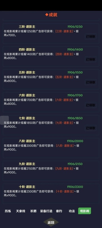 成就还能带来属性加成和银两奖励,到了后期加成的属性效果会变得十分显著!像历练、观影、天象这类内容,就只能依靠时间慢慢积累才能获得。