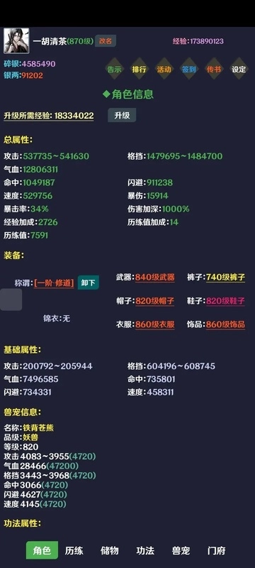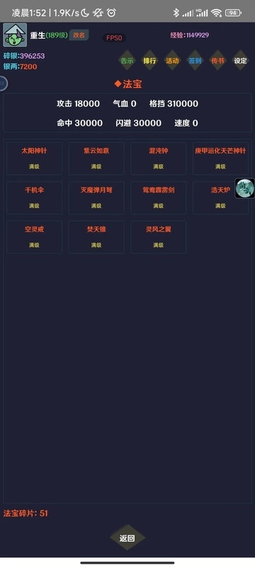 加了命中和格挡属性的法宝数值给得挺高,前期要是把它拉到一半的程度,不管是打塔还是开地图都会感觉很顺畅。