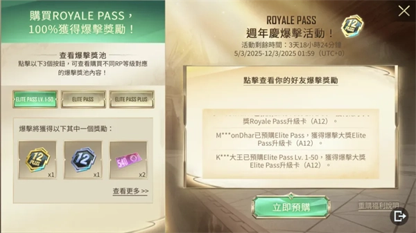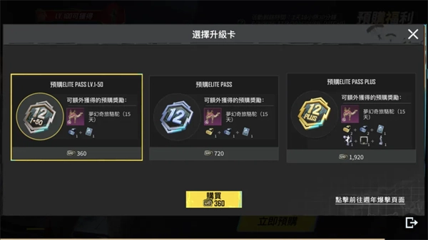 活动期间,特种兵可以选择预购Elite Pass Lv.1-50、Elite Pass或者Elite Pass Plus升级卡,等版本更新之后就能领取梦幻奇幻骆驼15天体验卡之类的福利啦!