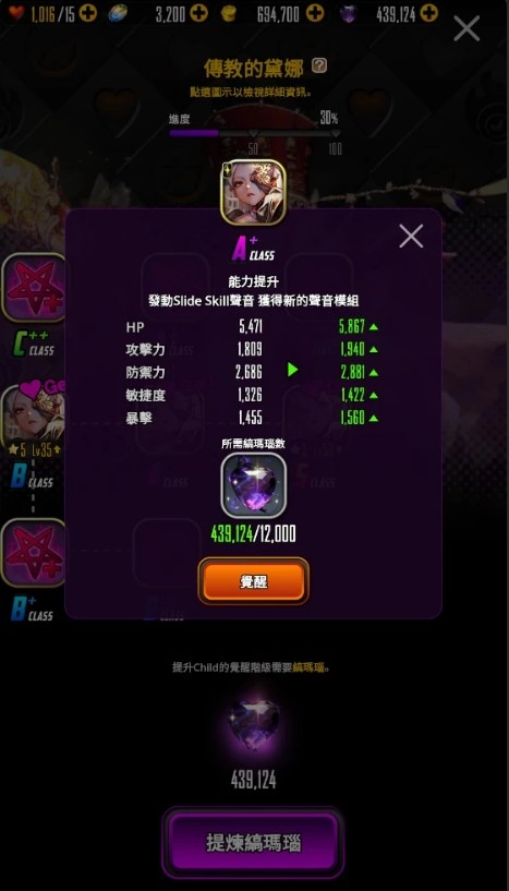 觉醒等级说明:当觉醒等级上升,角色的能力值将会被强化,同时也将解锁新台词和觉醒剧情。当角色的觉醒等级达到S之后,将解锁装饰品的字段,同时也能获得新的造型。