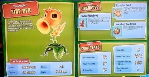火焰豌豆:它的攻击蕴含火焰属性,在豆子本身的基础伤害之外,火焰还能附着于目标,使其每秒承受4-5点伤害。该植物的射程属于中距离范围,且装填速度较快。