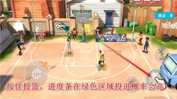 拿到球后我们就能投篮了,按住投篮键,进度条处于绿色区域时进球的几率会更大。