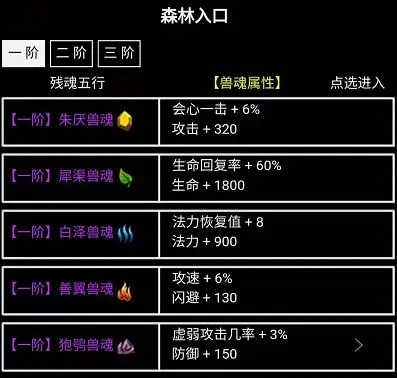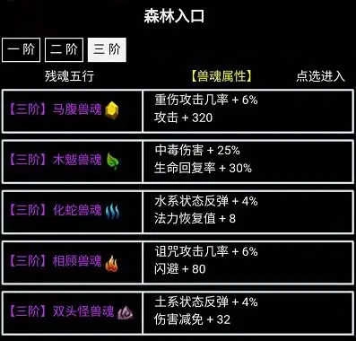 要是追求前期的高攻击力,或者想要后期的反弹效果,也可以考虑选择老虎兽魂。野狼兽魂和狐狸兽魂各自能提升生命力与法力,大家可以根据自身需求来挑选。二阶前期依旧不太建议选土系的野熊兽魂,毕竟这个阶段防御方面的收益比较低。