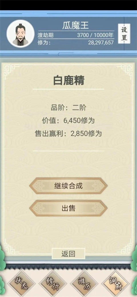 所以最划算的做法是每次选两个猫妖合成,合成白鹿精后就卖掉。等有了仙树,每轮这几千修为的收益就显得比较少了,加上操作麻烦又费时间,我通常就直接放弃这种做法了。