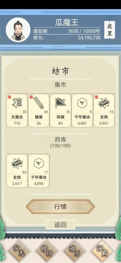 这其实就是个低买高卖的子系统,游戏到了中期,主要的收入来源基本就靠坊市倒卖商品了。要是运气好,能狠狠赚上一笔,那感觉别提多爽。别看坊市规模不大,里面却藏着不少炒股的思路——府库最多只能存5种商品,坊市每次刷新也最多出现5种。而且府库一开始的容量上限只有50件商品,得注意控制货物数量,单一商品别囤太多,不然运气差的时候可能要空等好几轮,根本赚不到钱。等手头资金宽裕了,库存空间最好优先留给玄铁和千年寒冰这两样大件。