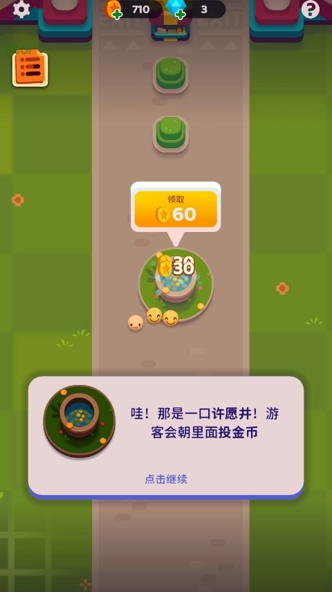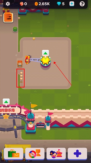 把游乐设施摆放好后,就会有游客前来游玩啦,图里那些小表情就是游客哦,点击设施上的“绿色箭头”就能继续升级啦;