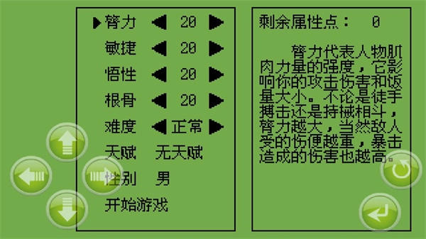 玩家在此处可对人物的臂力、敏捷、悟性、根骨等属性进行点数分配,随后点击开始游戏即可。