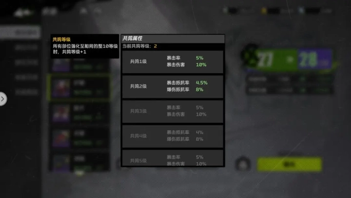当所有部位的强化登记数值达到10的整数倍时,就能触发共鸣属性效果,因此建议对各个部位进行均衡强化,提升所有部位的强化等级。